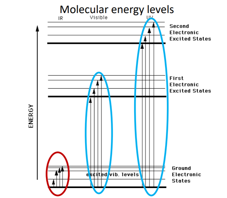IR cannot excite an electronic state. IR photons are so low in energy to excite. Visible can excite to first excited level. UV can excite to second excited electronic state.