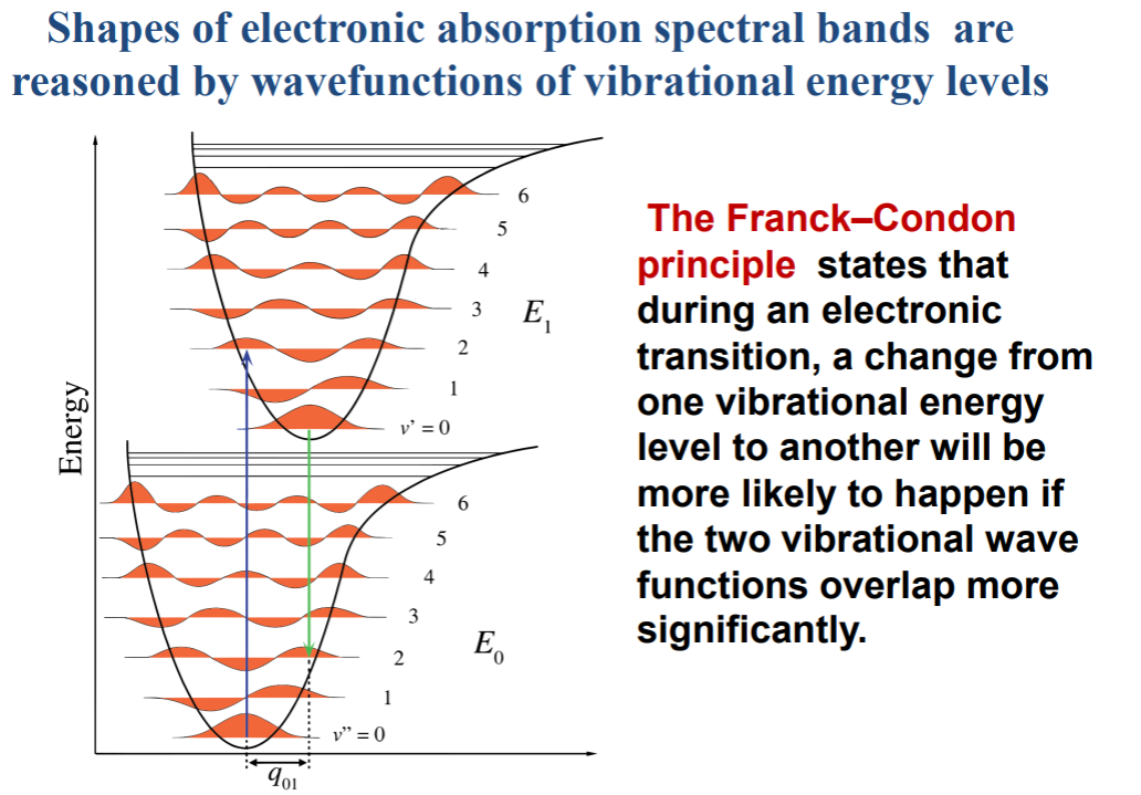 Now we can discuss why UV-Vis absorption spectral bands are broader. During an electronic transition, we simultenously access many vibrational levels since electronic transitions are fast (does it related to high uncertainy in where the transition will end at?). Excitations landing in many vibrational states is the Franck-Cordon principle actually.