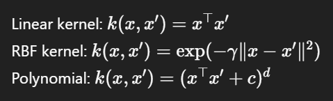 Kernel function is a similarity measure that allows the SVM to compute inner products in the feature space without ever computing 𝜙(𝑥) explicitly.