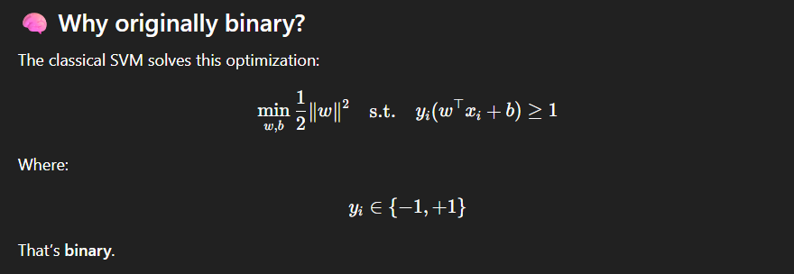 This is SVM optimization problem. Leading us to understand why is it originally a binary classifier and not Multi-class classifier.