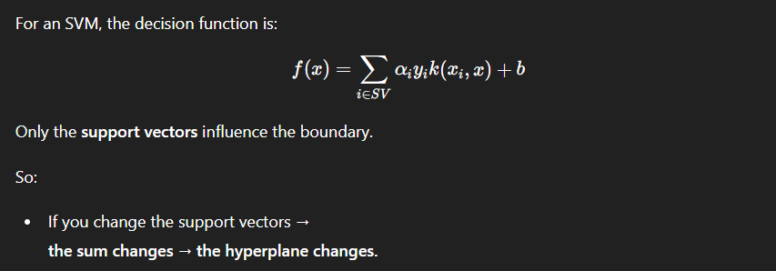 Support vectors are the data points of the training set that would influence or change the position of the dividing hyperplane if removed!!!